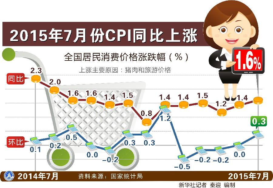 Пекин, 9 августа /Синьхуа/ -- Индекс потребительских цен Китая /CPI/ в июле 2015 года повысился на 1,6 проц по сравнению с показателем того же месяца 2014 года. Об этом сообщило в воскресенье Государственное статистическое управление КНР. -0-