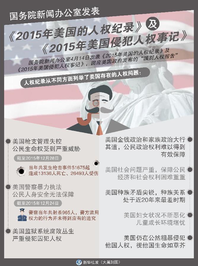 Пекин, 14 апреля /Синьхуа/ -- В 2015 году США не сумели достичь практического прогресса в обеспечении экономических и социальных прав населения. Об этом говорится в обнародованном сегодня Пресс-канцелярией Госсовета КНР докладе по положению дел с правами человека в США. >>