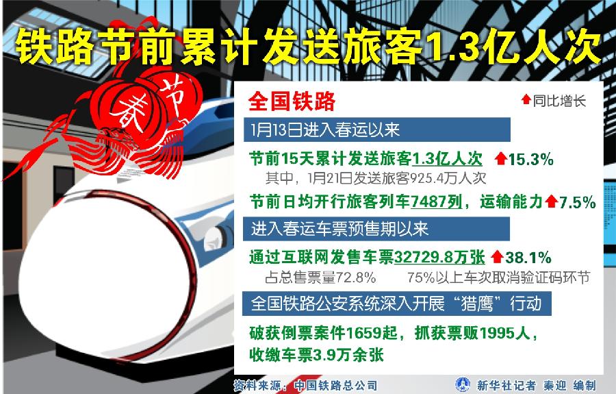 С момента поступления в продажу железнодорожных билетов на период "чуньюнь" /40-дневный особый решим работы транспорта в связи с праздником Весны/, через интернет было продано 327 млн 298 тыс билетов /72,8 проц от общего числа/, показатель вырос на 38,1 проц по сравнению с прошлым годом. При этом в Китае была развернута кампания по борьбе со спекулянтами, в этой сфере было раскрыто 1659 дел, задержано 1995 человек и изъято 39 тыс билетов.