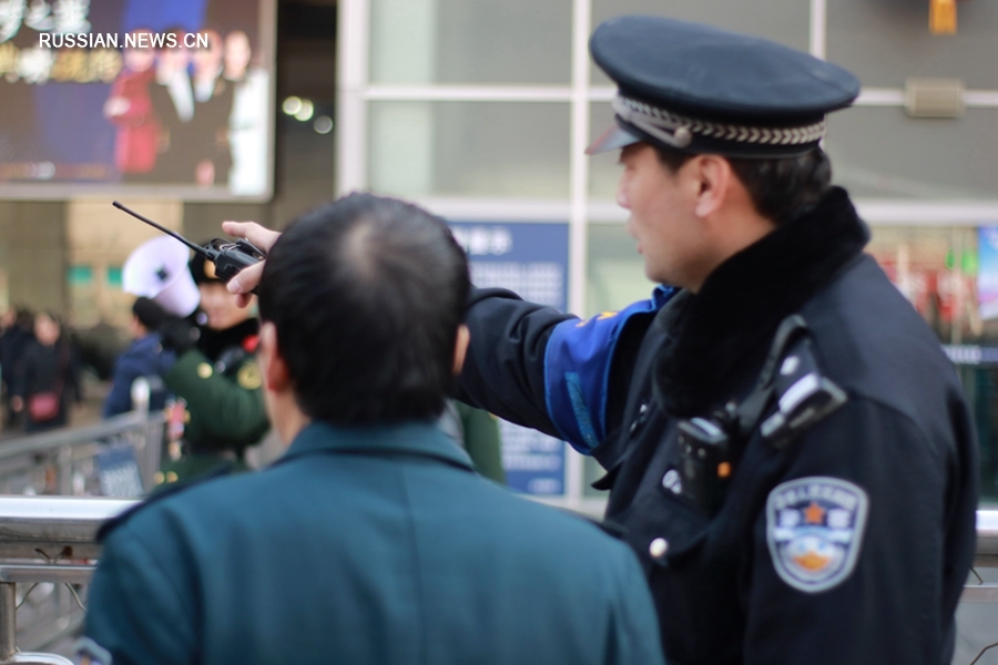 На фото: 13 февраля, полиция показывает пассажиру дорогу к входу для проверки билетов в пекинском западном вокзале. (Синьхуа/Хуан Хэ)