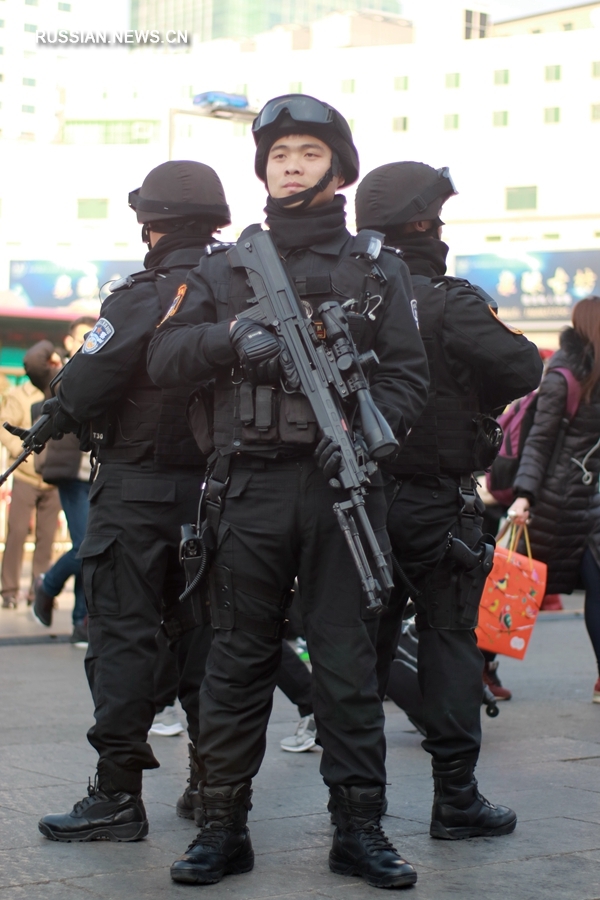 На фото: 13 февраля, в пекинском западном вокзале отряд милиции особого назначения ходят дозором. (Синьхуа/Хуан Хэ)