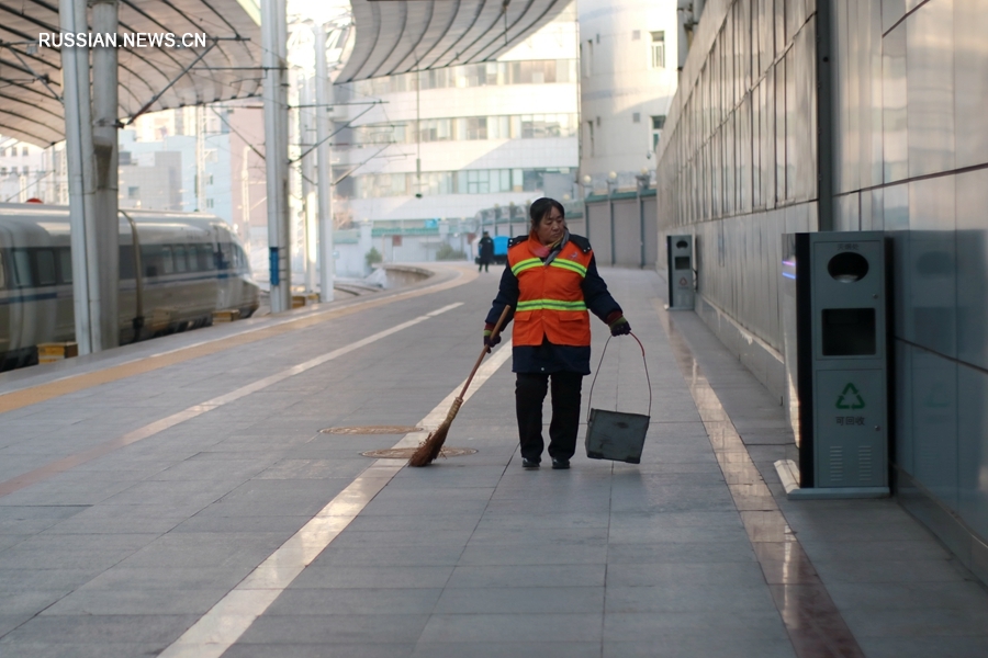 На фото: 13 февраля, в пекинском западном вокзале уборщик убирает платформу. (Синьхуа/Хуан Хэ)