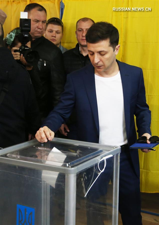 Киев, 21 апреля /Синьхуа/ -- Кандидат в президенты Украины Владимир Зеленский сегодня в Киеве вместе с супругой проголосовал во втором туре выборов главы государства. Фотографии Синьхуа/Сергей Старостенко