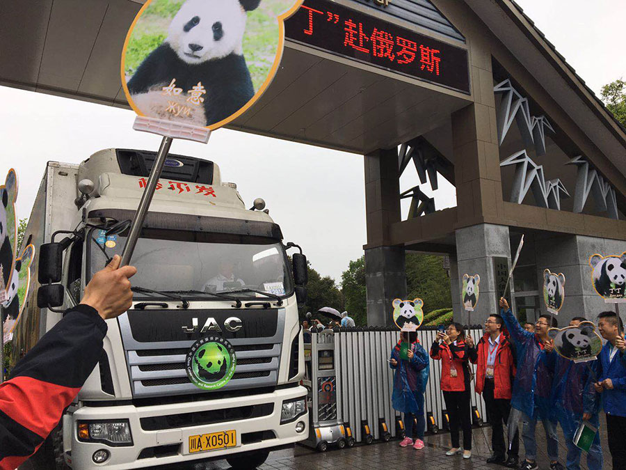 Яань /пров. Сычуань/, 29 апреля /Синьхуа/ -- Большие панды по кличам "Жуи" и "Диндин", переданные Китаем России, покинули базу "Бифэнся" Китайского центра по защите и изучению больших панд в городе Яань и направляются в аэропорт.