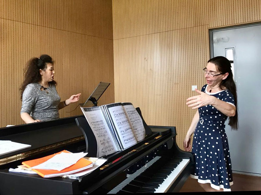 Ольга Еременко (справа) дает урок одному из преподавателей Харбинской консерватории. (Фото предоставлено интервьюируемым.)