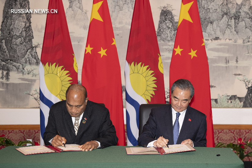 Нью-Йорк, 27 сентября /Синьхуа/ -- Член Госсовета КНР, министр иностранных дел Ван И и президент Республики Кирибати, министр иностранных дел Танети Маамау сегодня в стенах постоянного представительства Китая при ООН в Нью-Йорке подписали Совместное коммюнике о восстановлении дипломатических отношений между Китайской Народной Республикой и Республикой Кирибати. В тот же день между двумя странами были возобновлены дипломатические отношения на уровне послов.