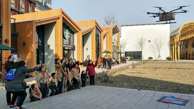 Дрон доставляет кофе из "Starbucks" в городе Ханчжоу, административном центре провинции Чжэцзян.
