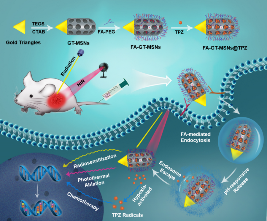 Ученые из упомянутого института изготовили наночастицы, сделанные из диоксида кремния и золота. Новый наноматериал, длиной около 200 нанометров и шириной 100 нанометров, достигает опухолевых тканей путем внутривенной инъекции, а также может быть загружен препарат тирапазамин, который помогает усилению противоопухолевого эффекта в отсутствие кислорода.