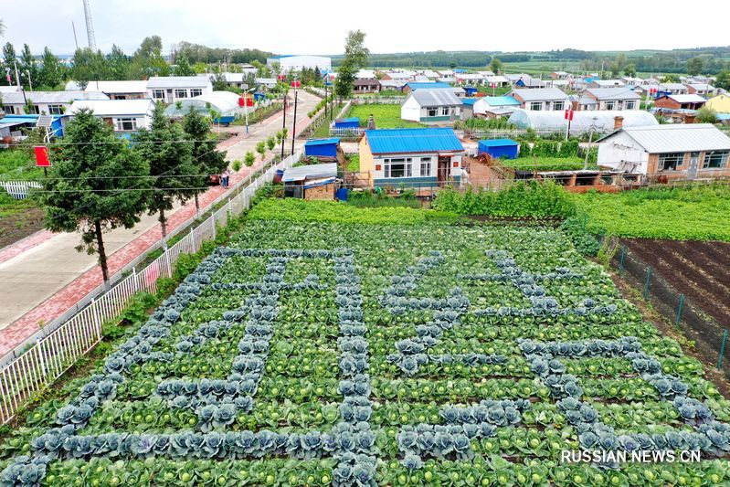 16 июля 2019 года, иероглифы "туаньцзе" /сплоченность/ "выросли" на грядке разноцветной капусты в огороде одного хозяйства деревни Туаньцзе в уезде Байцюань провинции Хэйлунцзян /Северо-Восточный Китай/. /Фото Синьхуа/