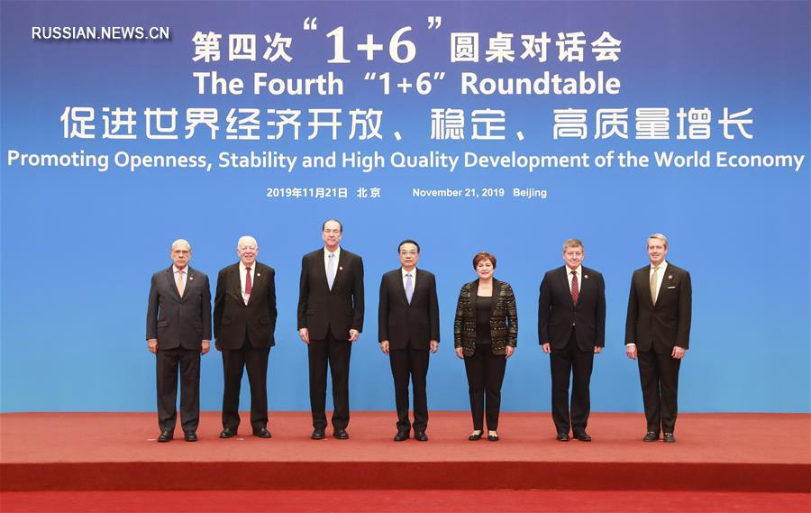 Пекин, 21 ноября /Синьхуа/ -- Премьер Госсовета КНР Ли Кэцян сегодня здесь провел встречу за круглым столом с руководителями 6 крупных международных экономических и финансовых организаций: президентом Всемирного банка Дэвидом Мэлпасом, директором-распорядителем Международного валютного фонда Кристалиной Георгиевой, заместителем генерального директора Всемирной торговой организации /ВТО/ Аланом Вулфом, генеральным директором Международной организации труда Гаем Райдером, генеральным секретарем Организации экономического сотрудничества и развития Анхелем Гурриа и председателем Совета по финансовой стабильности Рэндалом Куорлзом.