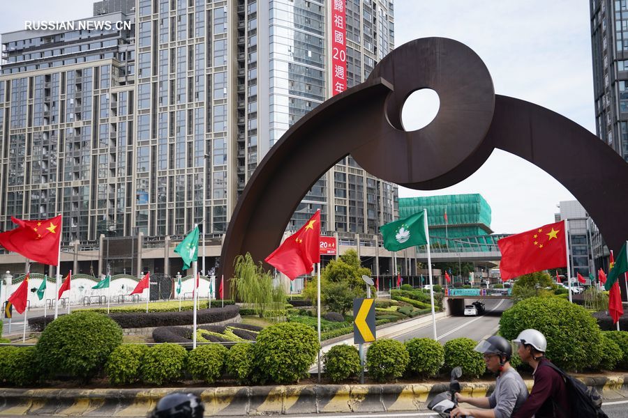 17 декабря 2019 года, государственные флаги КНР и флаги Специального административного района /САР/ Аомэнь развеваются близ "Восточной арки" в Аомэне. /Фото: Синьхуа/
