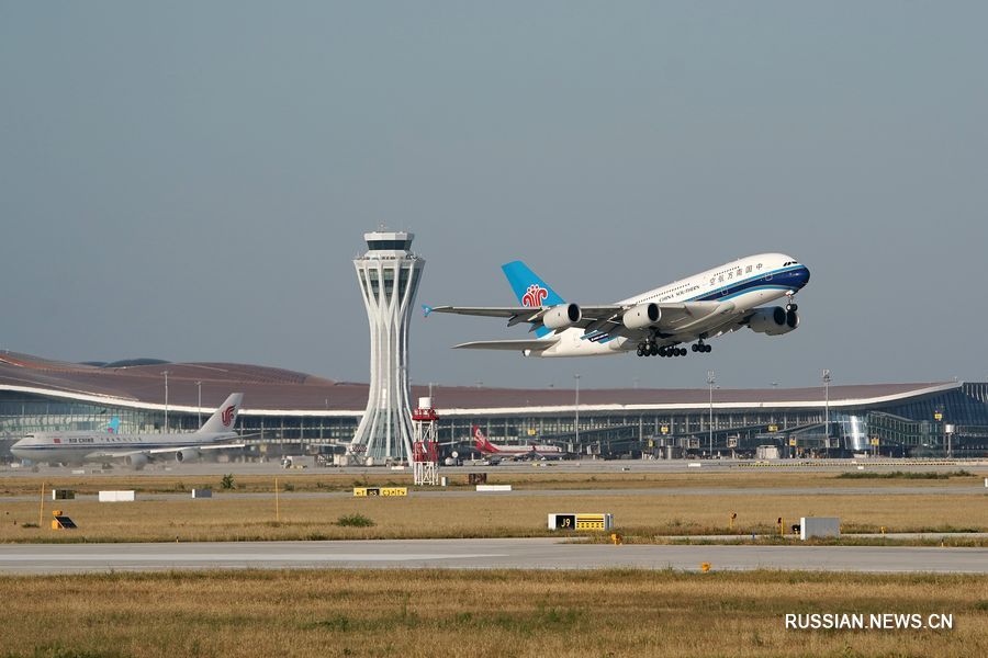 25 сентября 2019 года, самолет авиакомпании China Southern Airlines, выполняющий рейс CZ3001, вылетает из международного аэропорта "Дасин" в Пекине. /Фото: Синьхуа/