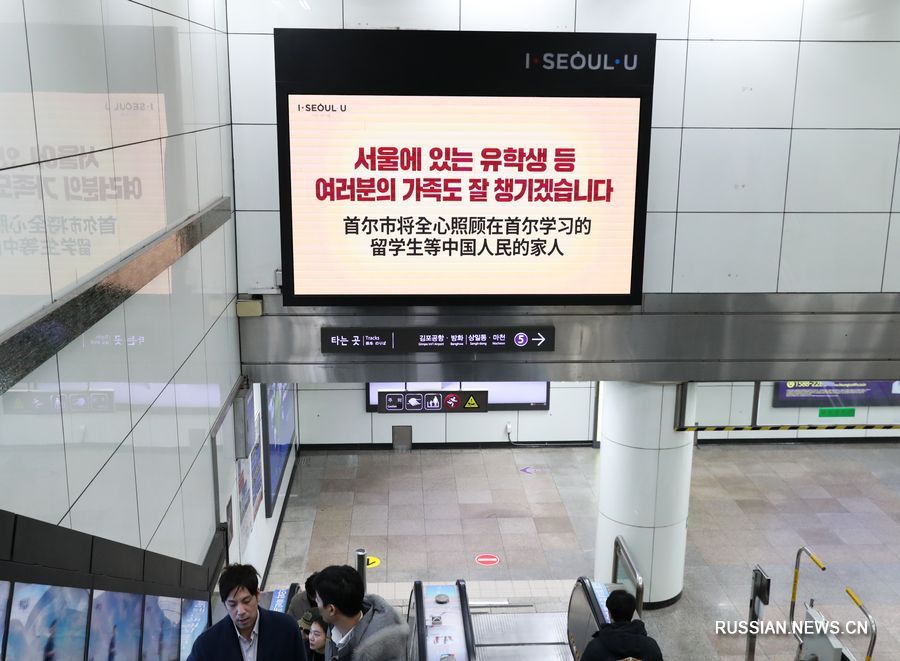 18 февраля 2020 года, на станции Кванхвамун в Сеуле Республики Корея транслируется видеоролик, поддерживающий Китай в борьбе с новой коронавирусной пневмонией COVID-19. /Фото: Синьхуа/
