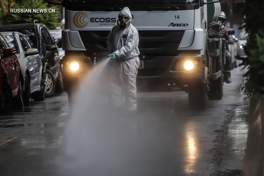 24 марта, бразильский город Сан-Паулу. Сотрудник дезинфицирует дорогу у больницы. /Фото: Синьхуа/