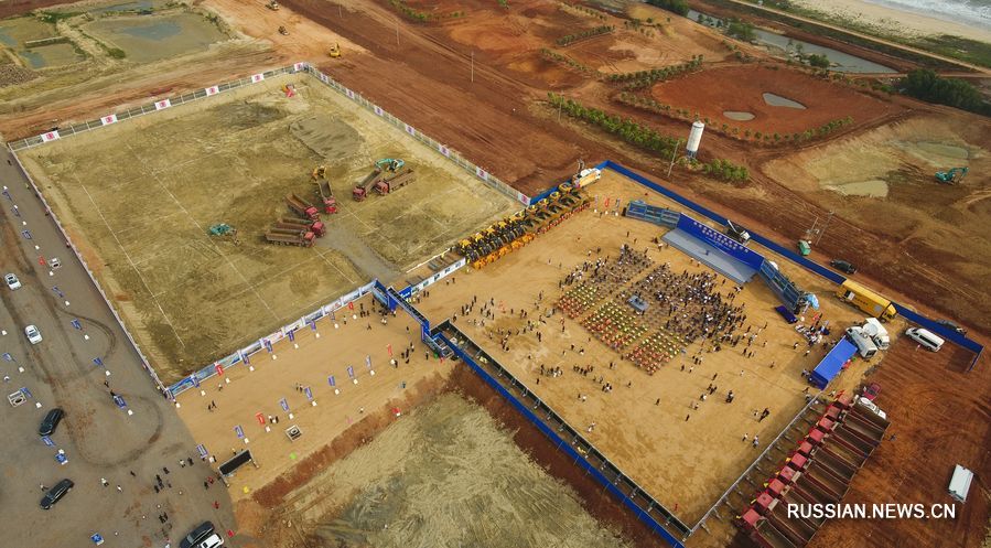 На данном снимке, сделанном 13 апредя, изображена церемония начала централизованных работ и подписания контрактов на строительстве Хайнаньского порта свободной торговли в Хайкоу. /Фото: Синьхуа/