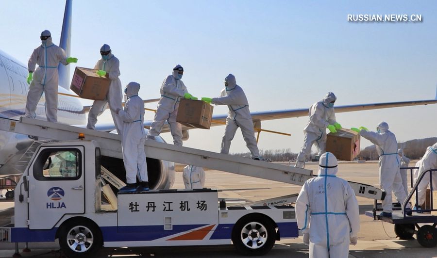 15 апреля 2020 года, работники перевозят медицинские средства в аэропорту города Муданьцзян провинции Хэйлунцзян на северо-востоке Китая. /Фото: Синьхуа/