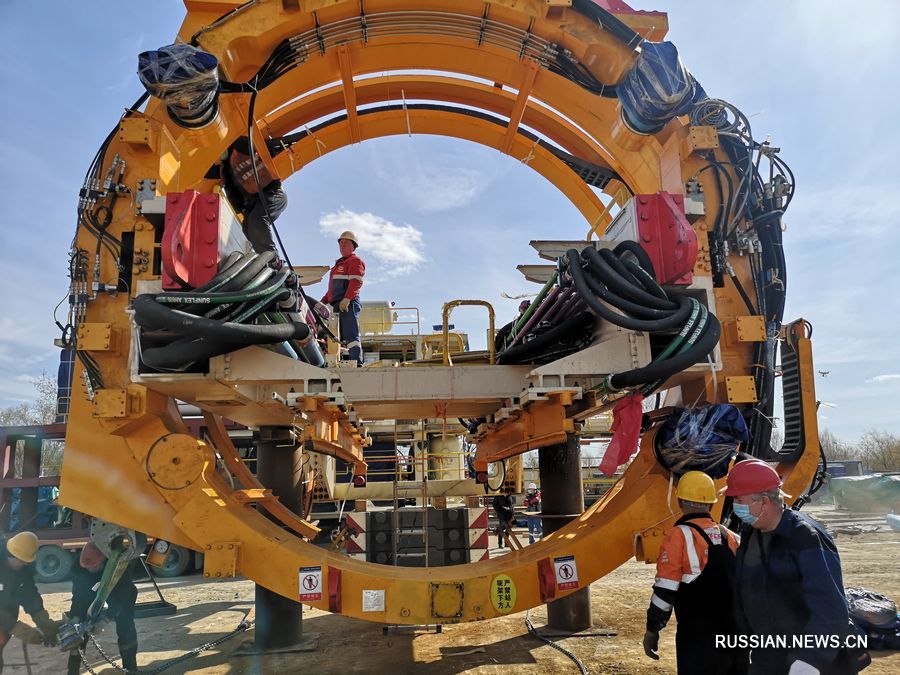 9 апреля работники занимаются сборкой щит-гиганта "Победа" для строительства метро в Москве. /Фото: Синьхуа/
