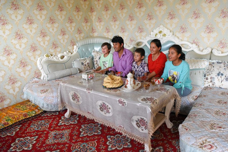 15 августа 2019 года, Ренагуль Карман /2-ая справа/ и ее семья смотрят телевизионные шоу дома в поселке Тунъань уезда Цзэпу города Кашгар Синьцзян-Уйгурского автономного района на северо-западе Китая. /фото: Синьхуа/