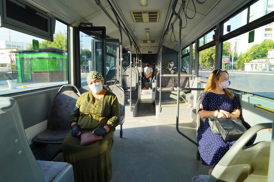 8 июня, Ташкент. Люди в масках в автобусе. /Фото: Синьхуа/
