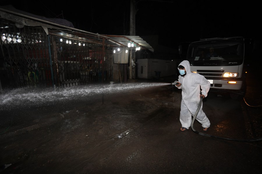 30 июня, работник дезинфицирует одну из улиц на западе Багдада, столицы Ирака. /Фото: Синьхуа/