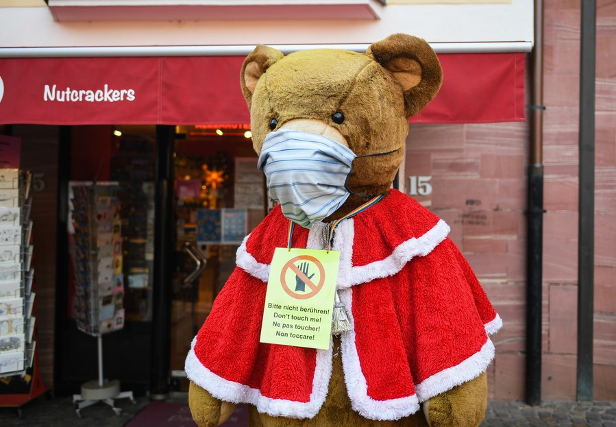 25 ноября, Франкфурт-на-Майне, Германия. Плюшевый медведь в маске перед магазином сувениров. /Фото: Синьхуа/