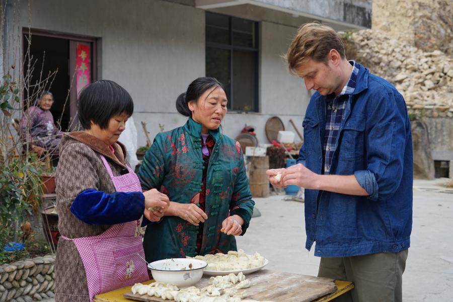 3 февраля 2021 года, Д. Доронин лепит пельмени вместе с жителями деревни Хэнчжан. /Фото: Синьхуа/