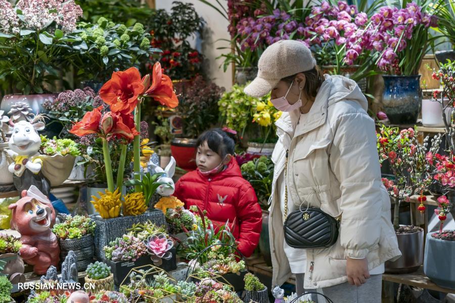 Шанхай, 15 февраля /Синьхуа/ -- В дни каникул по случаю Праздника весны /Нового года по китайскому лунному календарю/ на цветочном рынке Хунцяо в Шанхае идет бойкая торговля свежими цветами. Фотографии Синьхуа/Ван Сян