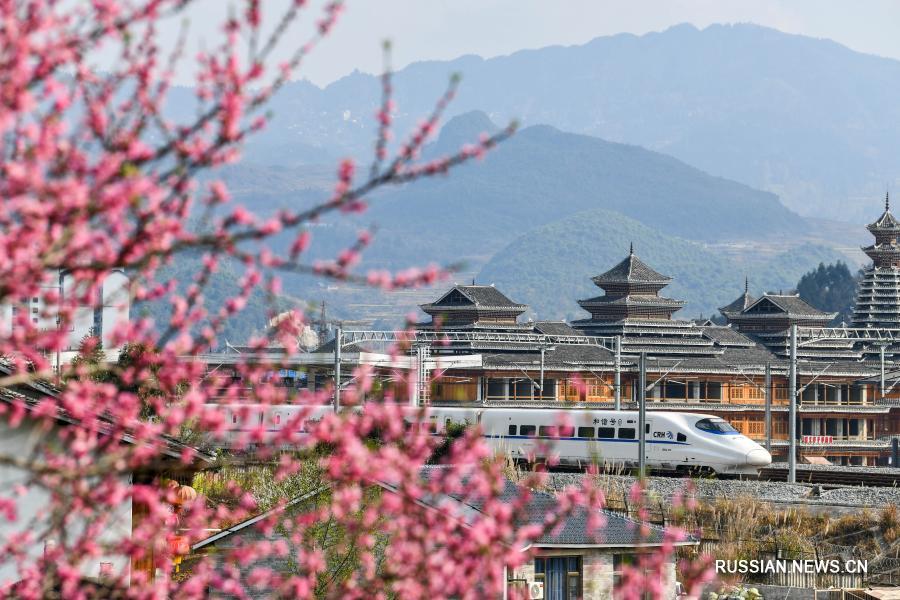 Цунцзян /пров. Гуйчжоу/, 24 февраля /Синьхуа/ -- С приходом весны в Цяньдуннань-Мяо-Дунском автономном округе /провинция Гуйчжоу, Юго-Западный Китай/ наступила пора цветения рапса. На персиковых и вишневых деревьях также распустились весенние цветы. На фото -- поезд посреди живописных полей, усыпанных цветами.