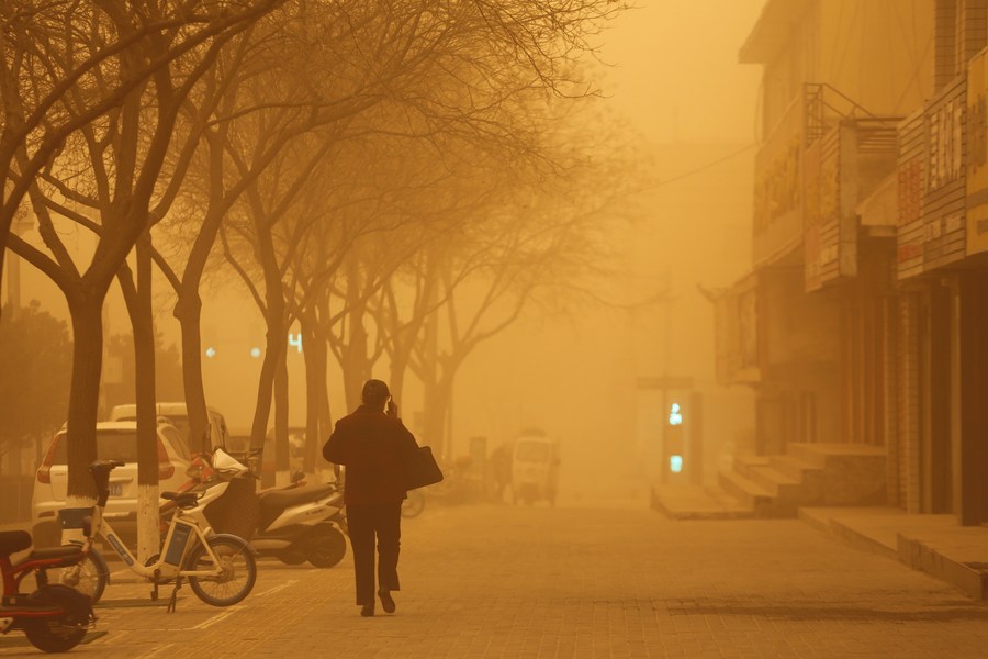 15 марта 2021 года, женщина идет по тротуару во время сильной песчаной бури в городе Увэй пров. Ганьсу /Северо-Западный Китай/. /Фото: Синьхуа/
