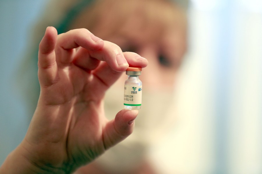 29 марта, Бишкек. Медработница показывает упаковку китайской вакцины от COVID-19. /Фото: Синьхуа/