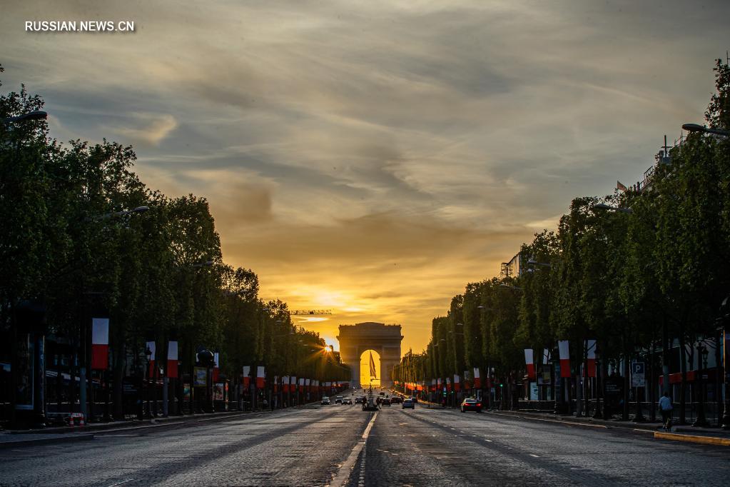 Париж, 9 мая /Синьхуа/ -- Закат солнца на фоне Триумфальной арки на проспекте Елисейские поля в Париже, столице Франции.