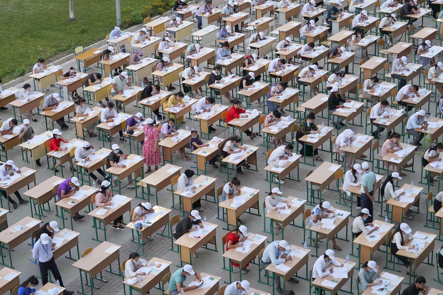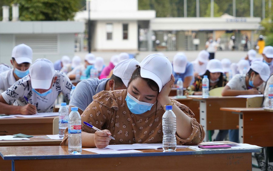 5 августа, Ташкент. Школьники сдают вступительные экзамены на открытом воздухе. /Фото: Синьхуа/