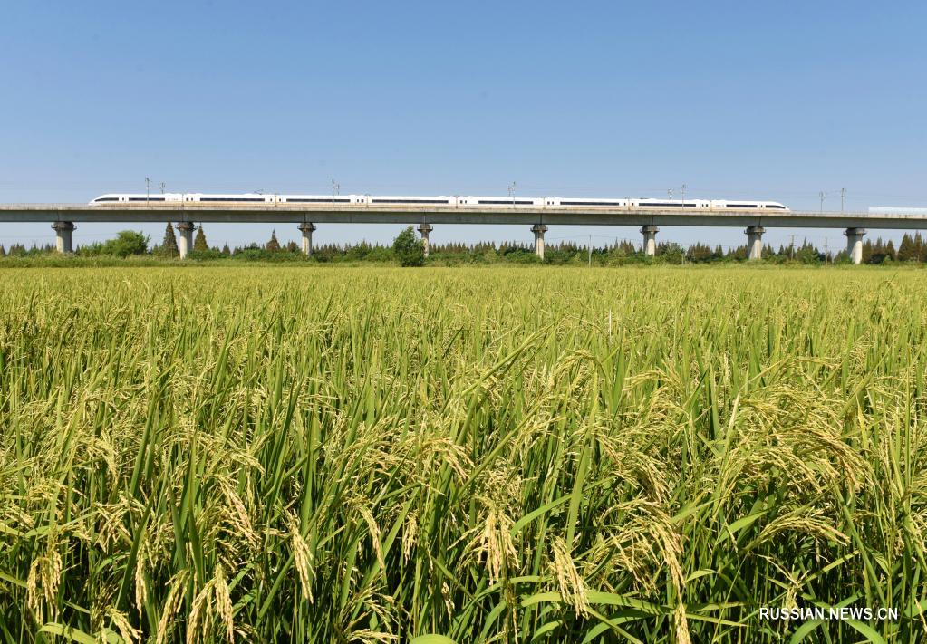 Пекин, 23 сентября /Синьхуа/ -- В четверг в разных регионах Китая отмечают Праздник урожая китайских крестьян, который был учрежден в Китае в 2018 году. Этот праздник совпадает с днем осеннего равноденствия - одним из 24 сезонов традиционного китайского сельскохозяйственного календаря. День осеннего равноденствия приходится на 22, 23 или 24 сентября в зависимости от года, когда в Китае во всю идет сбор урожая сельскохозяйственных культур. На фото: высокоскоростной пассажирский поезд проходит мимо рисовых полей.