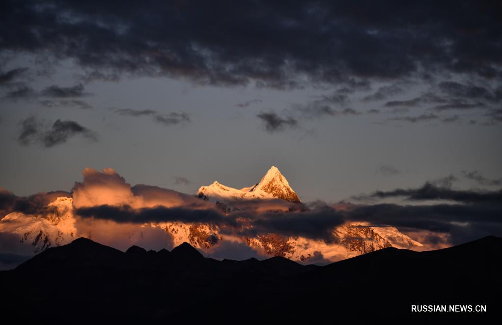 Ньингчи /Тибетский АР/, 18 октября /Синьхуа/ -- Вершина Намджагбарва, расположенная на восточной оконечности Гималаев, является самой высокой горной вершиной в городском округе Ньингчи Тибетского автономного района /Юго-Западный Китай/. Круглогодично покрытый снегом треугольный пик в лучах заходящего солнца выглядит особенно живописно.