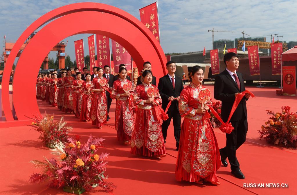 Наньнин, 25 октября /Синьхуа/ -- Коллективная свадебная церемония, организованная для своих работников строительной компанией Shanghai Civil Engineering Group of CREC, состоялась сегодня на одной из стройплощадок высокоскоростной железной дороги Гуйян -- Наньнин в уезде Умин /Гуанси-Чжуанский автономный район, Южный Китай/. 64 пары молодоженов, облаченные в традиционные свадебные наряды, рука об руку вступили в новую, совместную жизнь.