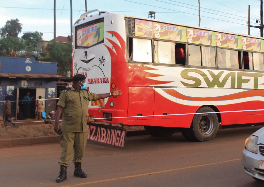 25 октября, Уганда. Полицейский оцепляет место взрыва автобуса. /Фото: Синьхуа/