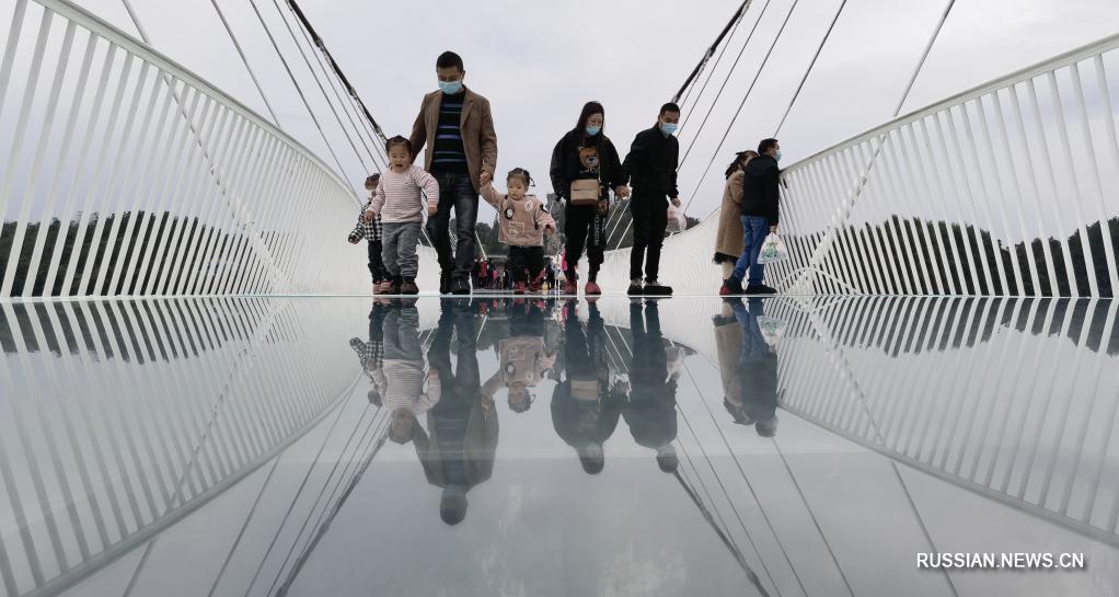 Чжанцзяцзе /пров. Хунань/, 12 ноября /Синьхуа/ -- Стеклянный мост через большой каньон в городском округе Чжанцзяцзе /провинция Хунань, Центральный Китай/ расположен на высоте 300 м над дном ущелья. Его длина составляет 430 м, а ширина -- 6 м. Весь мост выложен из прозрачных стеклянных панелей, благодаря чему прогуливающиеся по нему туристы могут отчетливо видеть отвесные скалы и испытать ощущение, как будто парят в воздухе. Фотографии Синьхуа/Чжао Чжунчжи