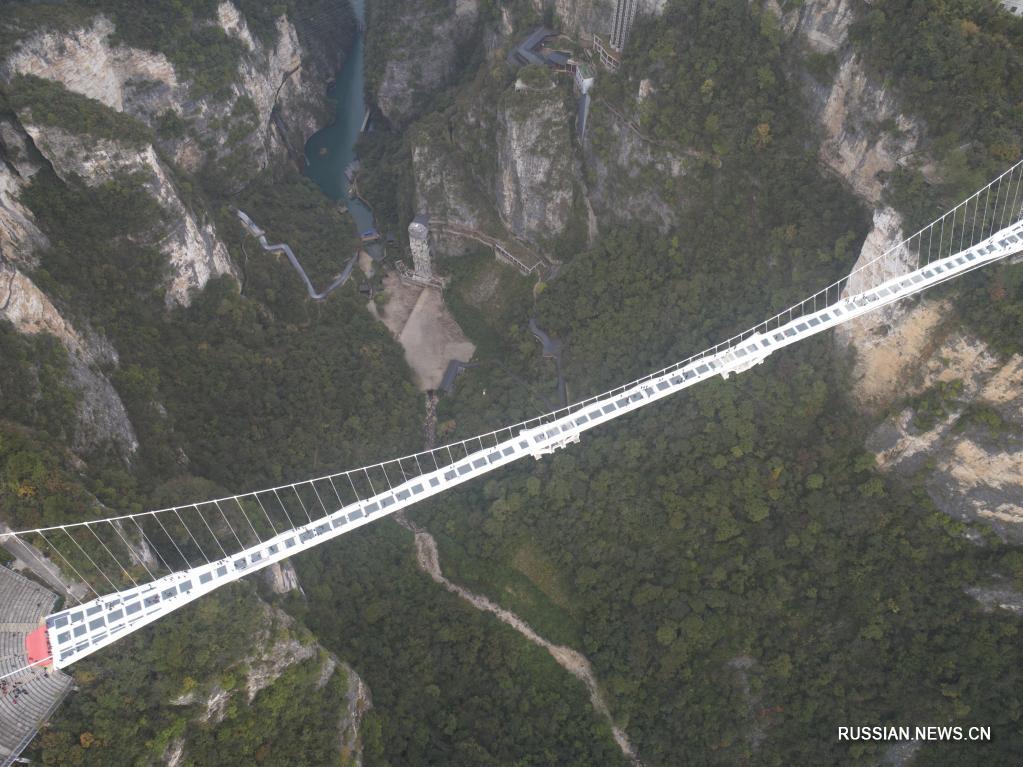 Чжанцзяцзе /пров. Хунань/, 12 ноября /Синьхуа/ -- Стеклянный мост через большой каньон в городском округе Чжанцзяцзе /провинция Хунань, Центральный Китай/ расположен на высоте 300 м над дном ущелья. Его длина составляет 430 м, а ширина -- 6 м. Весь мост выложен из прозрачных стеклянных панелей, благодаря чему прогуливающиеся по нему туристы могут отчетливо видеть отвесные скалы и испытать ощущение, как будто парят в воздухе. Фотографии Синьхуа/Чжао Чжунчжи