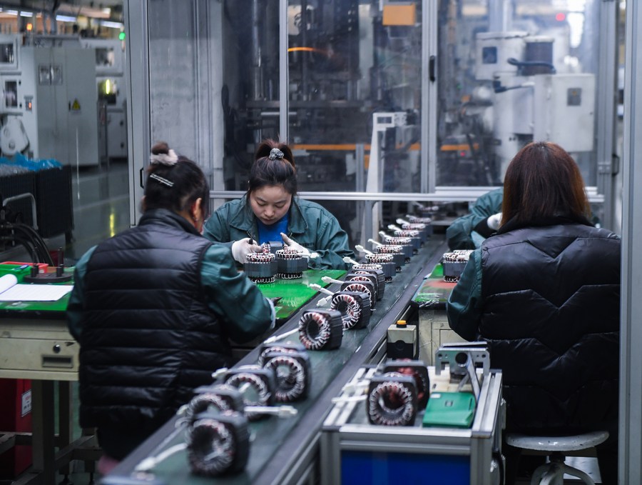 30 декабря 2021 года, сотрудники работают в цеху предприятия по разработке и производству компрессоров холодильников в г. Цзясин пров.Чжэцзян на востоке Китая. /Фото: Синьхуа/