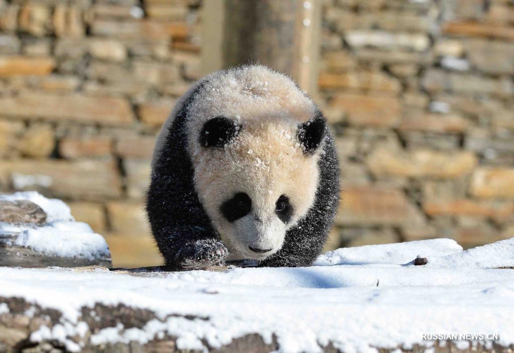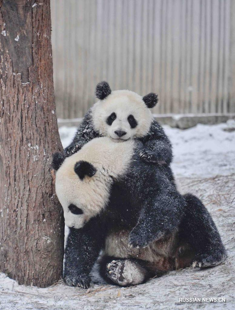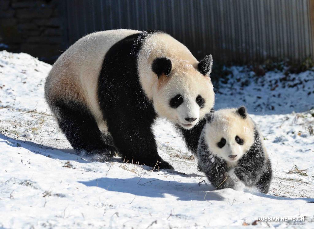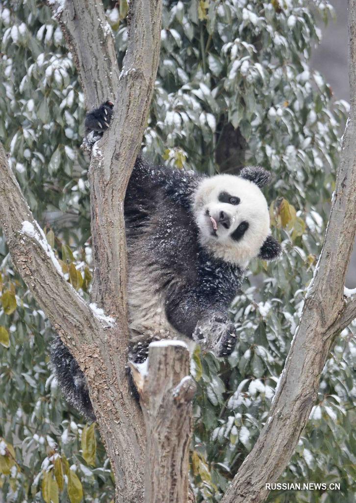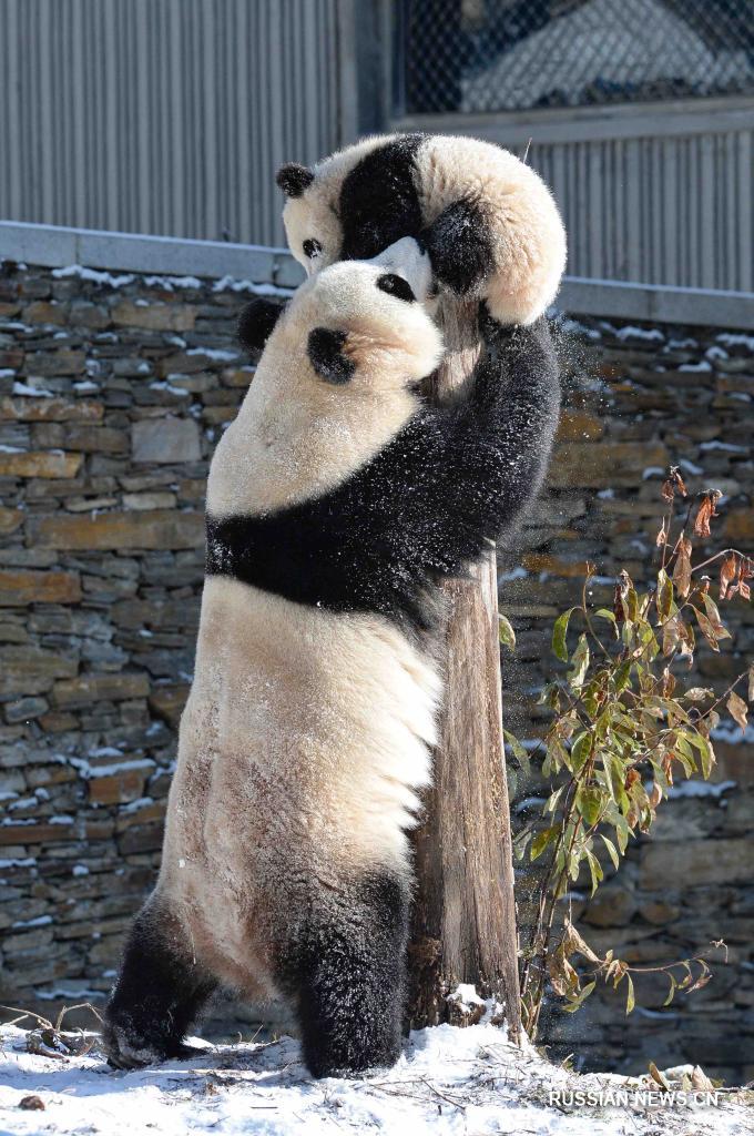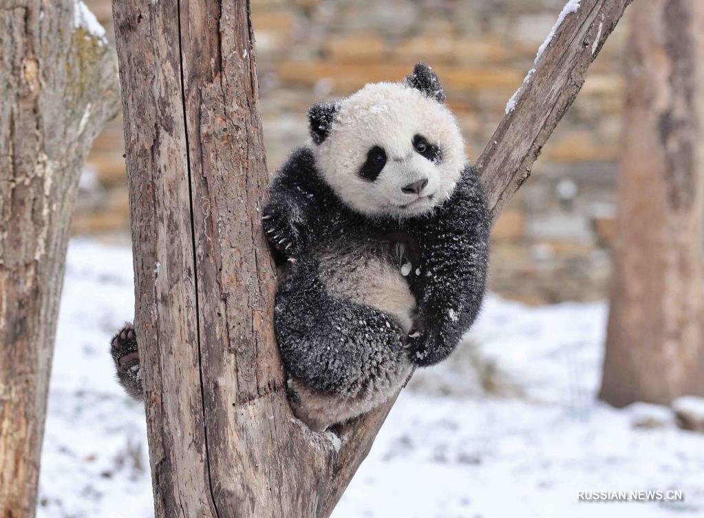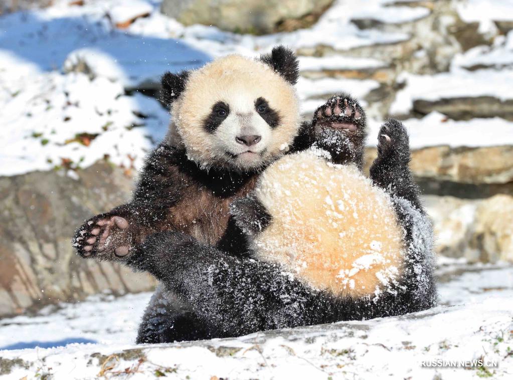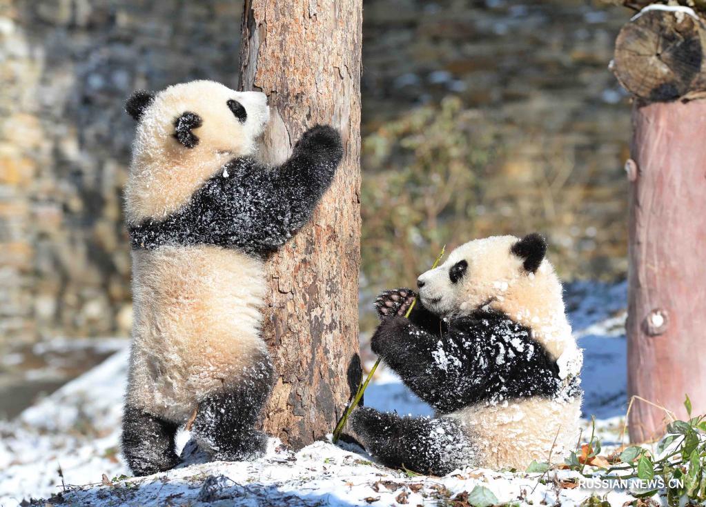 9 февраля 2022 года, панды играют в снегу на базе Шэньшупин Китайского центра по охране и исследованию больших панд в природном заповеднике Волун /провинция Сычуань, Юго-Западный Китай/. (Фотографии Синьхуа)