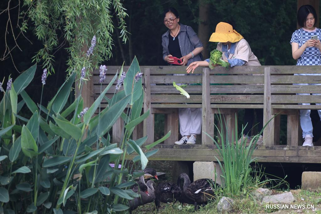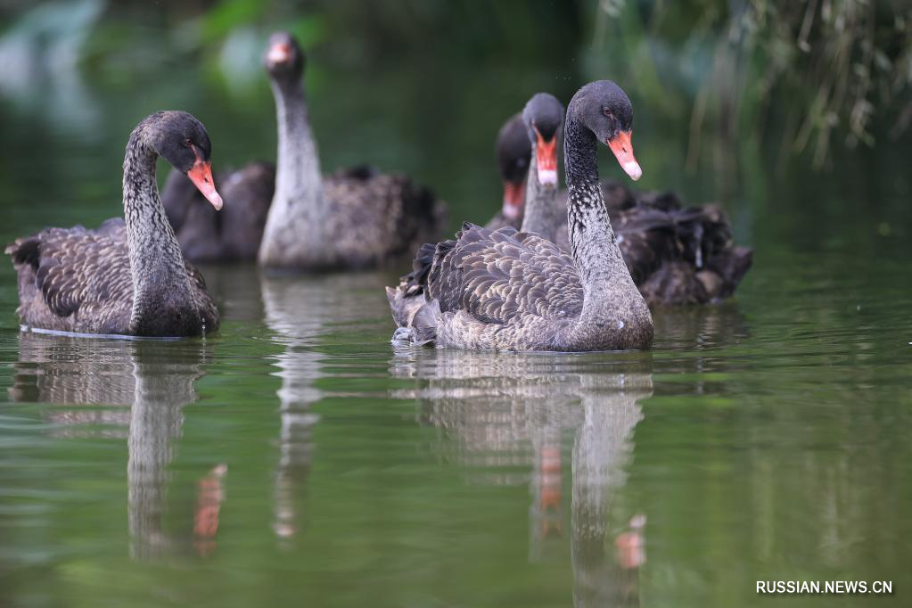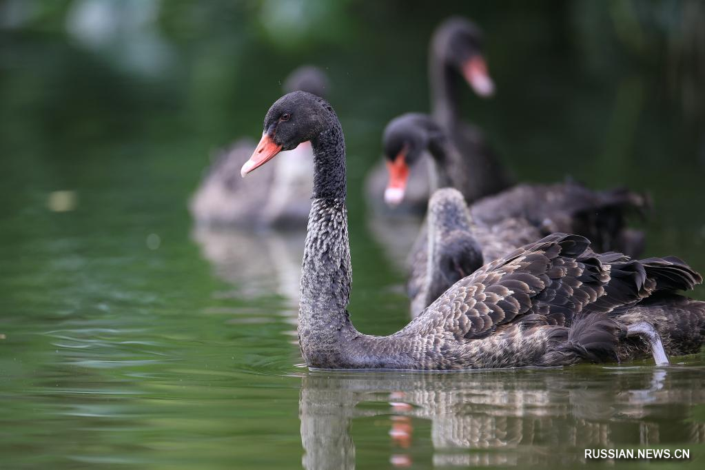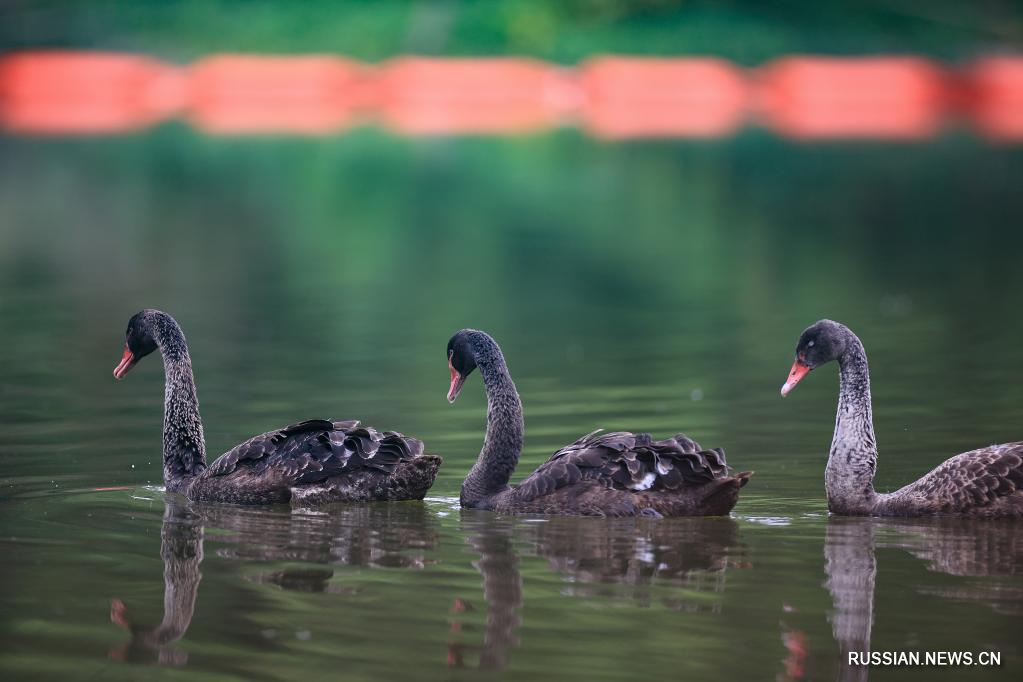 На фото от 8 июня 2022 года -- Черные лебеди появились в парке Гуаньшаньху в городе Гуйян провинции Гуйчжоу /Юго-Западный Китай/. /Фото: Синьхуа/
