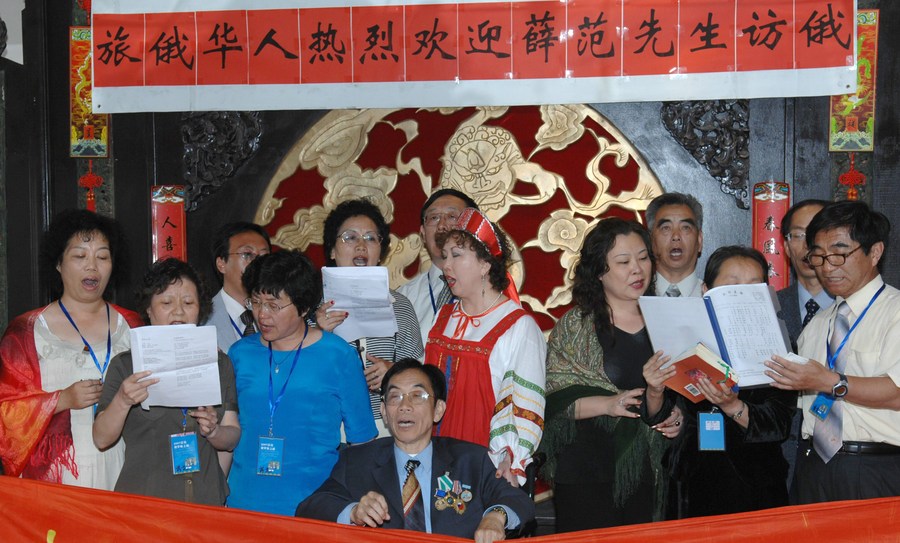 28 июня 2007 года, Москва, 73-летний Сюэ Фань /четвертый слева/ во время своего первого визита в Россию поет вместе с проживающими в РФ китайцами российские и советские песни, переведенные им на китайский язык. /Фото: Синьхуа/