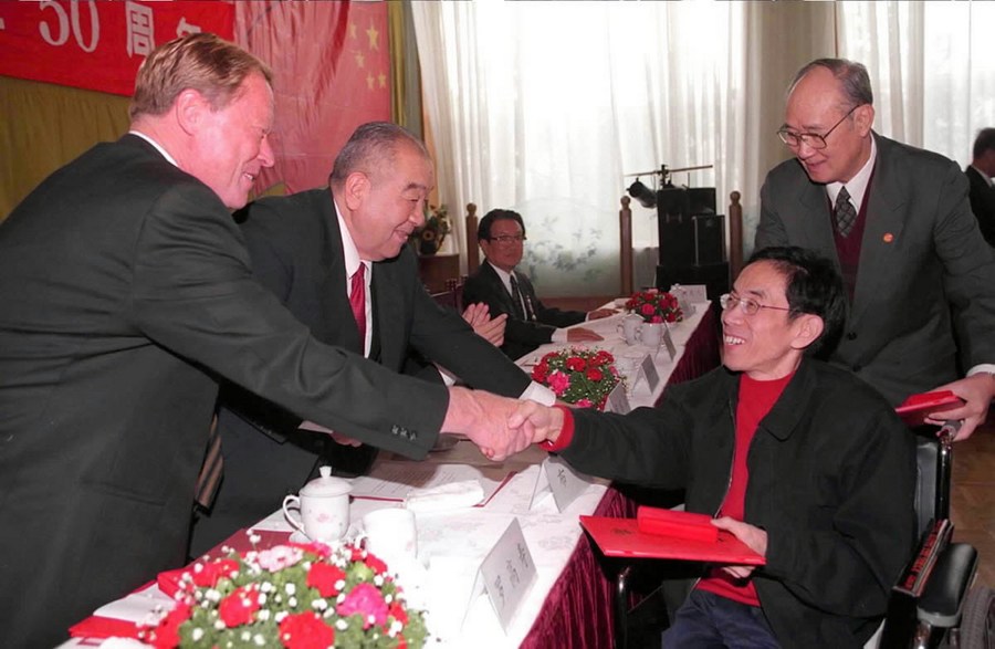 5 октября 1999 года, Пекин, заместитель председателя ПК ВСНП Бухэ /второй слева/ и посол РФ в КНР Игорь Рогачев /первый слева/ вручают Сюэ Фаню медали и почетные грамоты китайско-российской и российско-китайской дружбы. /Фото: Синьхуа/