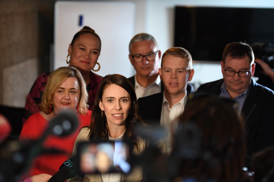 18 октября 2020 года, Окленд, Новая Зеландия. Джасинда Ардерн /вторая слева/ и Крис Хипкинз /второй справа/. /Фото: Синьхуа/