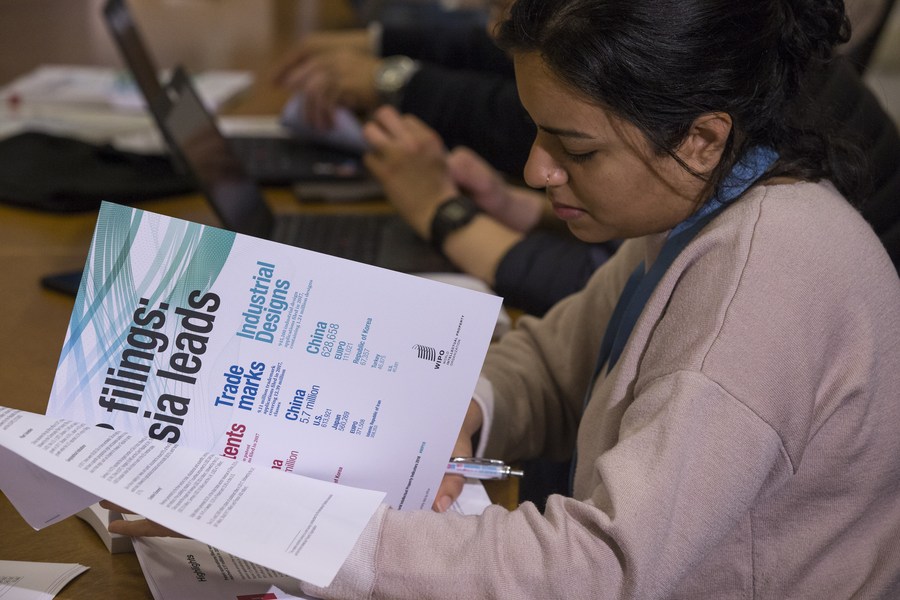 3 декабря 2018 года, журналистка читает ежегодный доклад World Intellectual Property Indicators /WIPI/ на пресс-конференции Всемирной организации интеллектуальной собственности /WIPO/ в Женеве. /Фото: Синьхуа/