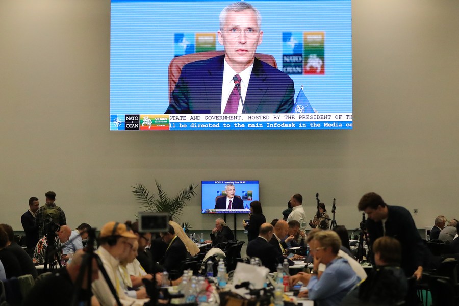 11 июля, Вильнюс. Генеральный секретарь НАТО Йенс Столтенберг на экране в медиа-центре саммита НАТО. /Фото: Синьхуа/