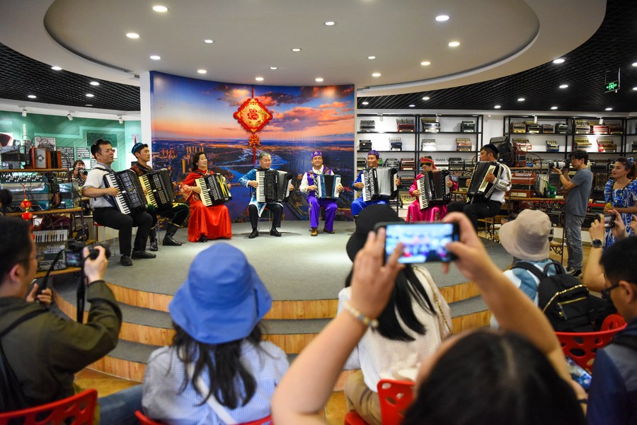 19 мая 2023 года, туристы смотрят выступление аккордеонистов в местном музее культуры в квартале "Люсинцзе" города Инин Синьцзян-Уйгурского автономного района /СУАР, Северо-Западный Китай/. /Фото: Синьхуа/
