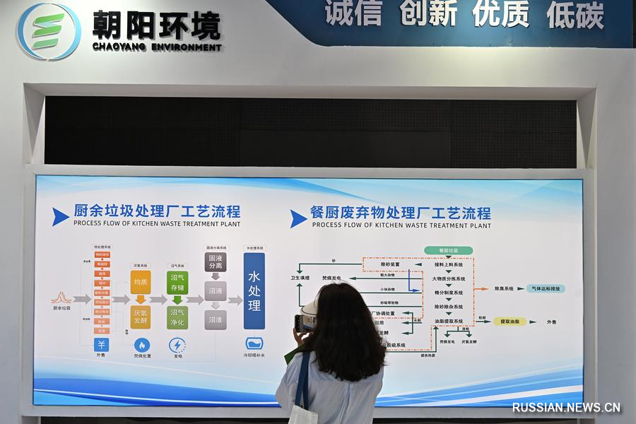 2 сентября 2023 года, Пекин. Посетитель изучает технологический процесс завода по переработке кухонных отходов на выставке экологических услуг в рамках Китайской международной ярмарки торговли услугами 2023 года /CIFTIS-2023/ в Пекине. /Фото: Синьхуа/