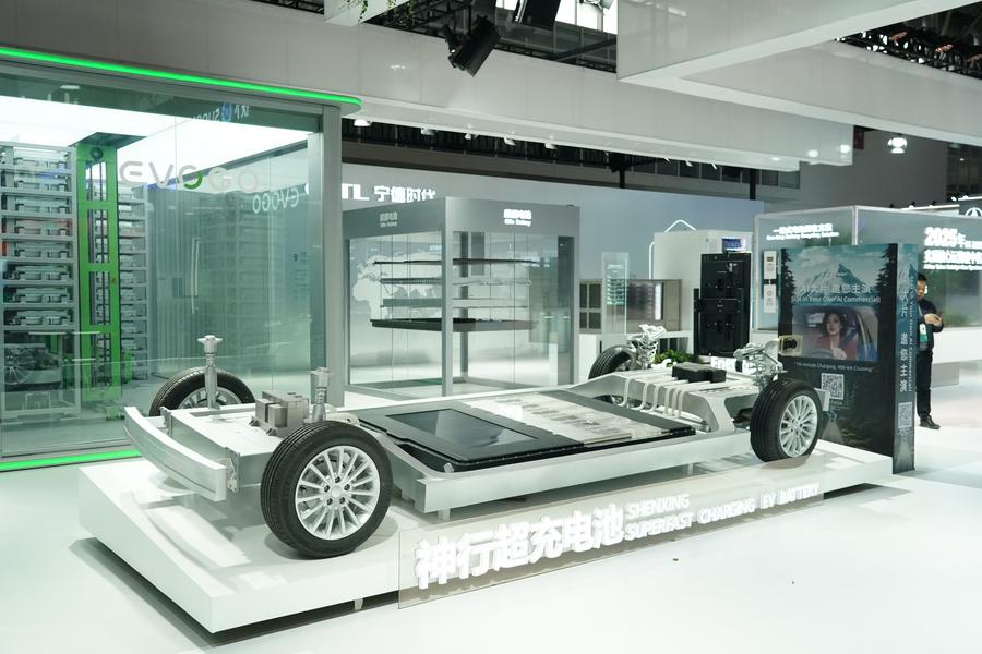 26 ноября 2023 года, платформа сверхбыстрой зарядки для аккумуляторов электромобилей, представленная китайским аккумуляторным гигантом Contemporary Amperex Technology Co., Ltd. на 1-й Китайской международной выставке по стимулированию цепочек поставок в Пекине. /Фото: Синьхуа/