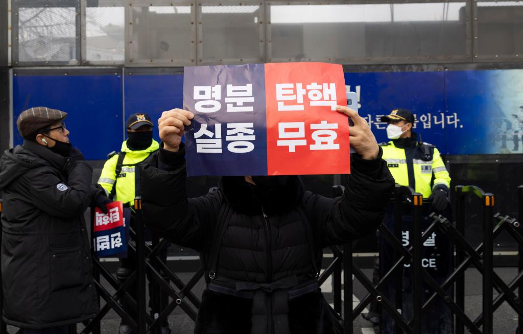 21 января, Сеул. Сторонник арестованного Юн Сок Еля показывает плакат против импичмента на акции протеста возле Конституционного суда. /Фото: Синьхуа/